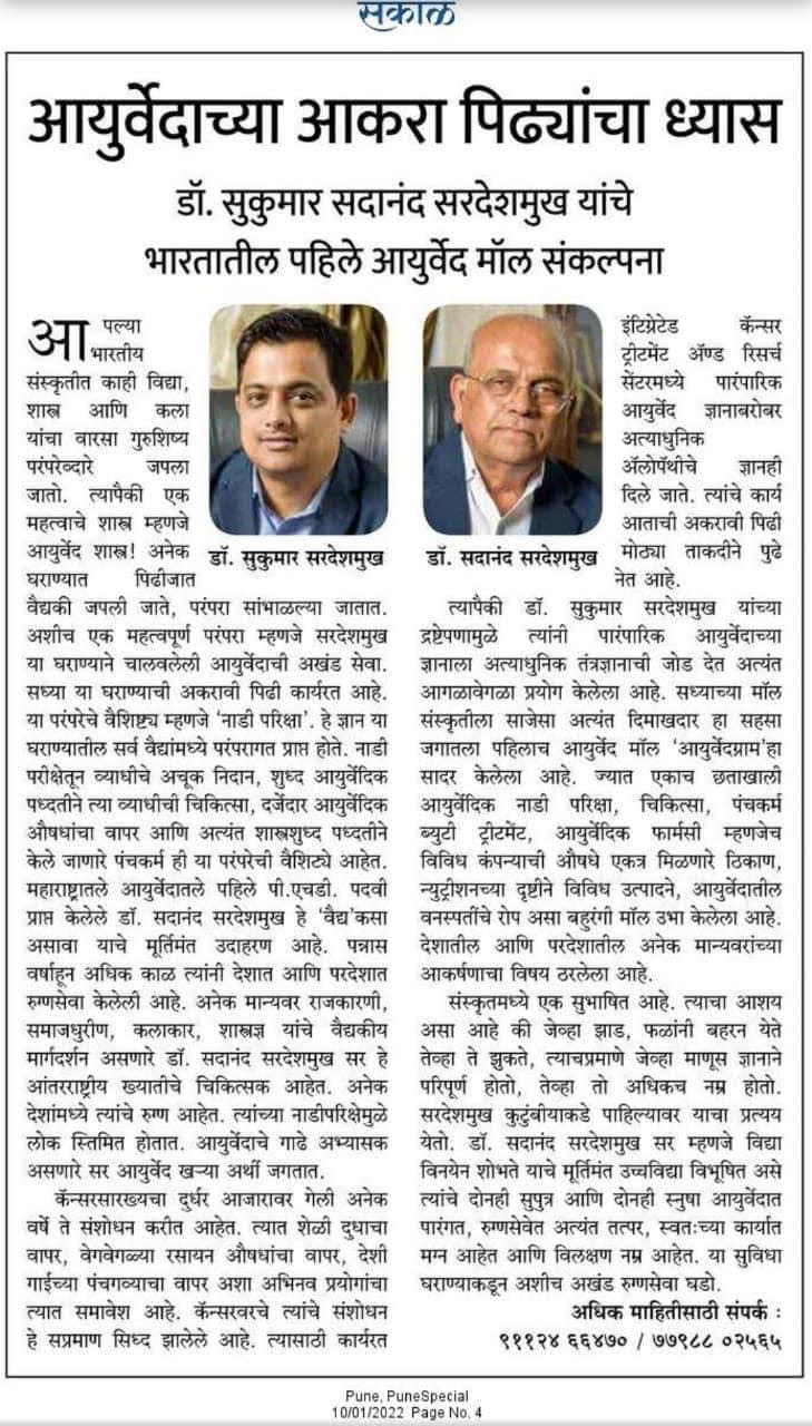 2022年1月10日付インドの新聞「Sakal」に掲載された記事に、サダナンダ先生及びスクマール先生のアーユルヴェーダ医師としての取り組みが紹介されています。原文はマラティ語ですが、Mayur Gondhalekarさんが英訳してくれましたのでこちらに転載させていただきます。
